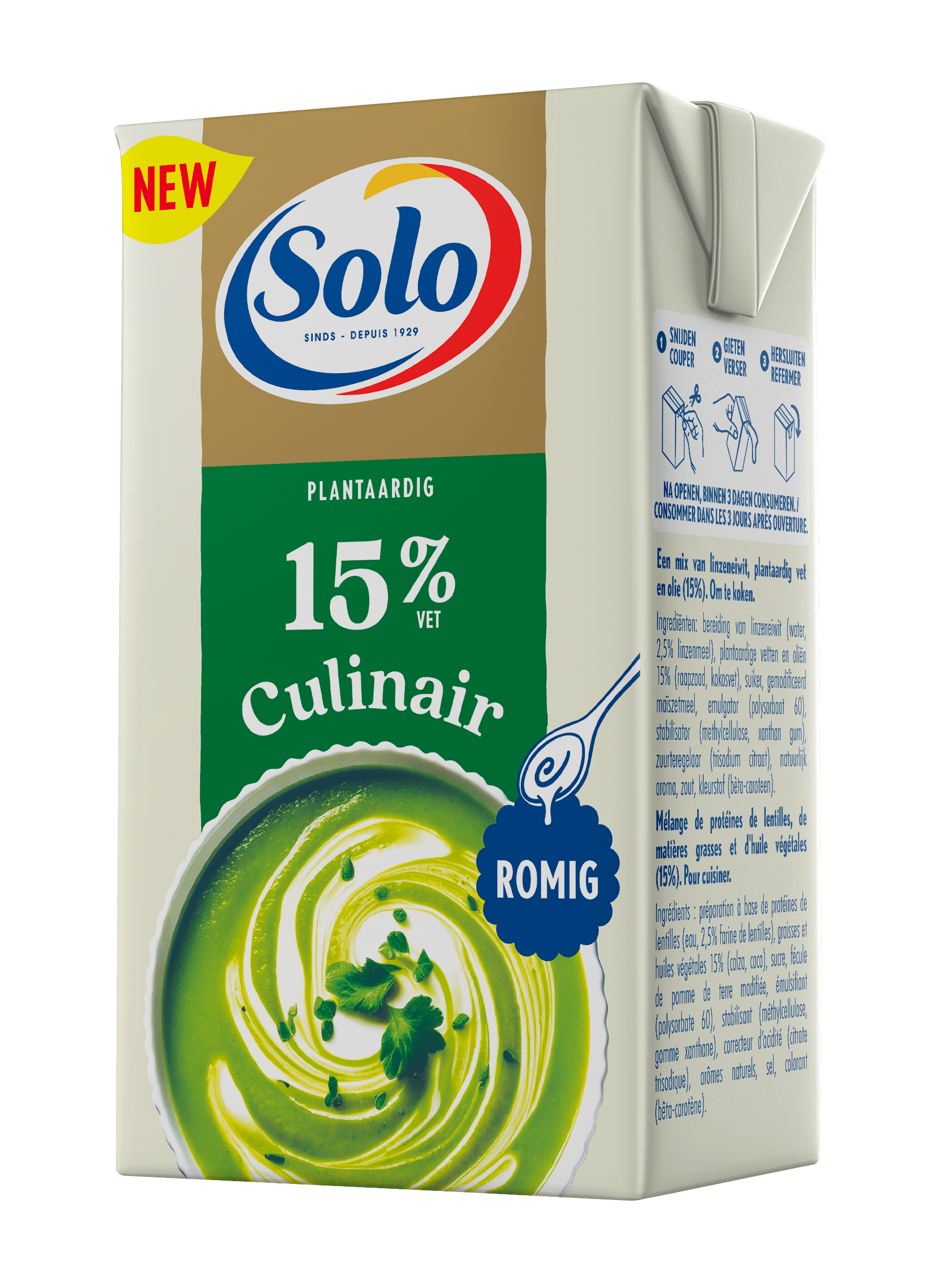 Rijk, romig en 100% plantaardig: Solo Culinair 15% mengt perfect en blijft stabiel met andere ingrediënten. Zonder soja of lactose en heerlijk smeuïg, is het ideaal om al je gerechten te verrijken – van elke dag tot speciale gelegenheden.